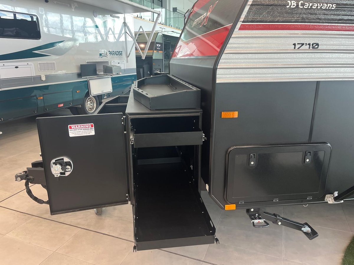 - New 2025 Raptor Coated Toolbox with built in stone guard and wood box and Slide Out Drawers for your gas bottles and fridge/BBQ slide so you can organize and access your gear with ease.