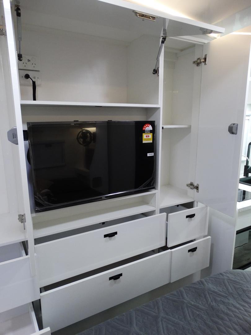 - Granite black sink & waterfall benchtop – A stylish, modern touch to your mobile kitchen.