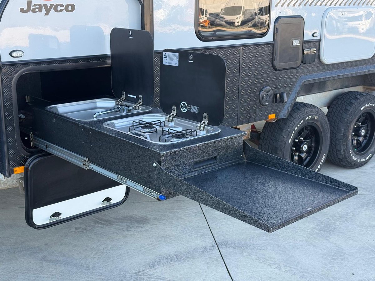 The Jayco All-Terrain 17.55 is a compact off-road pop top built for couples who want comfort without limits. With a tough galvanised chassis, independent suspension and all-terrain tyres, it’s ready for both highways and bush tracks. Inside, you’ll find a smart layout with a comfy bed, full kitchen, ensuite bathroom and modern touring essentials — making it ideal for weekend escapes or extended adventures around Australia.