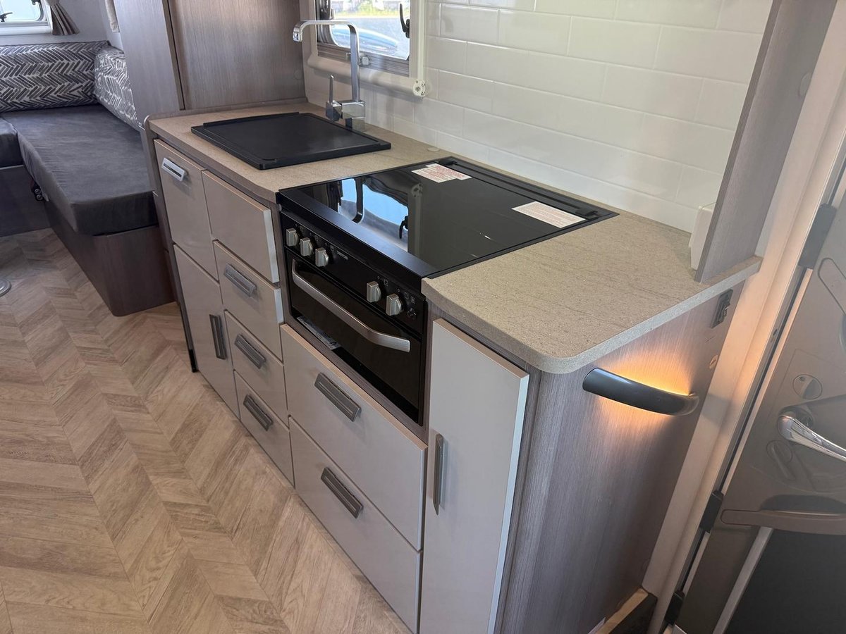 Inside, the clever 4-berth layout features a spacious rear club lounge with large panoramic windows, creating the perfect space to relax or dine. Sleeping is taken care of with an electric drop-down bed and overhead cab bed, comfortably accommodating up to four people.